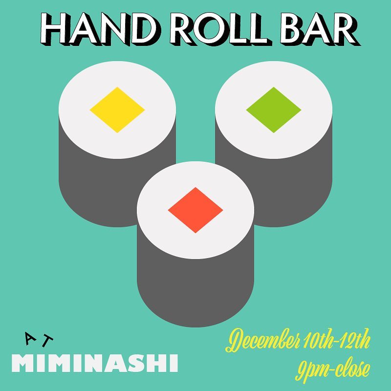 @chefmiminashi Friends! Next week we starting our late night Hand Roll Bar at Miminashi. Starting at 9pm on December 10th-12th, we’ll have fresh hand roll sets (3 for $15/6 for $25) that come with a complimentary mini @asahibeer. We know it’s dark and chilly out, but this is definitely one to head out of hibernation for! Hope to see you then (and before then). 💥